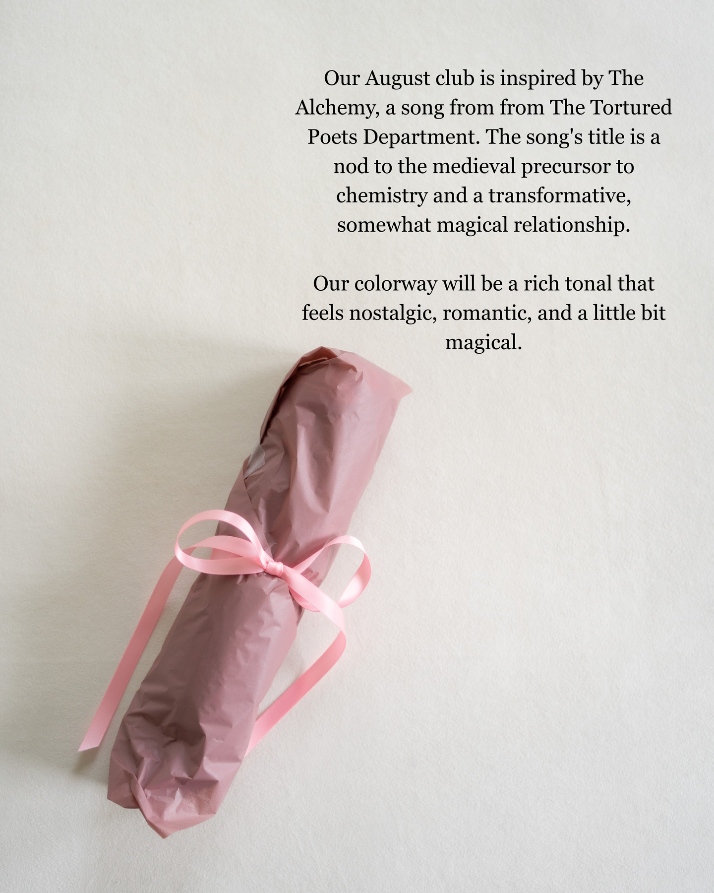 Our August club is inspired by The Alchemy, a song from from The Tortured Poets Department. The song's title is a nod to the medieval precursor to chemistry and a transformative, somewhat magical relationship. Our colorway will be a rich tonal that feels nostalgic, romantic, and a little bit magical.