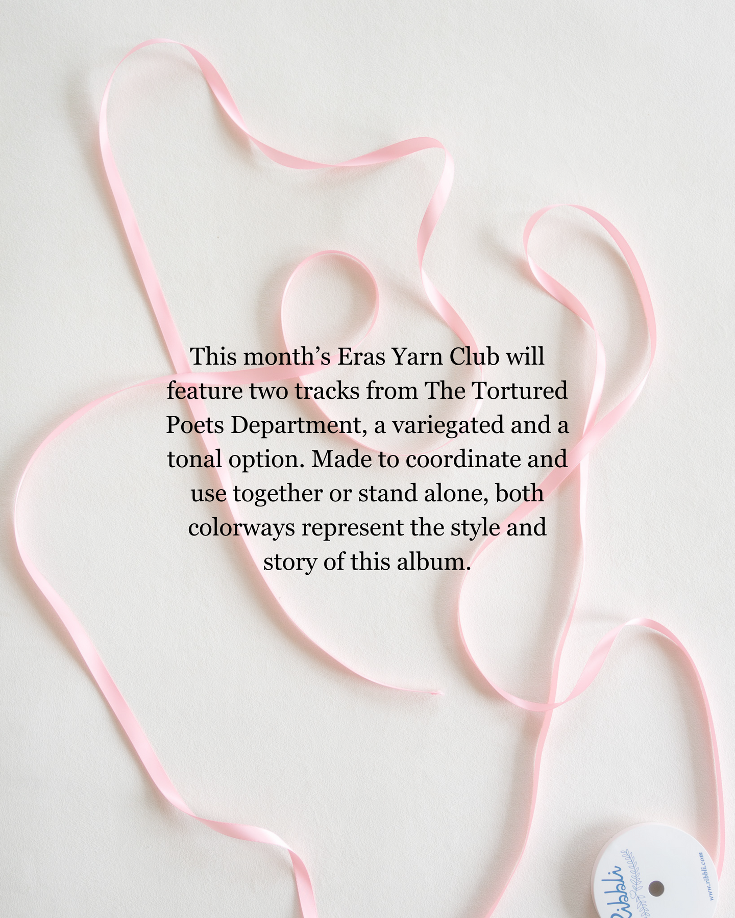 The Eras Yarn Club is released monthly with a new song feature and surprise colorway. Order one skein or a project quantity on any of our 15 base yarn options. Our club is not a recurring subscription, you can order as the theme suits you in the base and quantities you prefer without any commitments. Our yarn club processing time is 3-4 weeks.