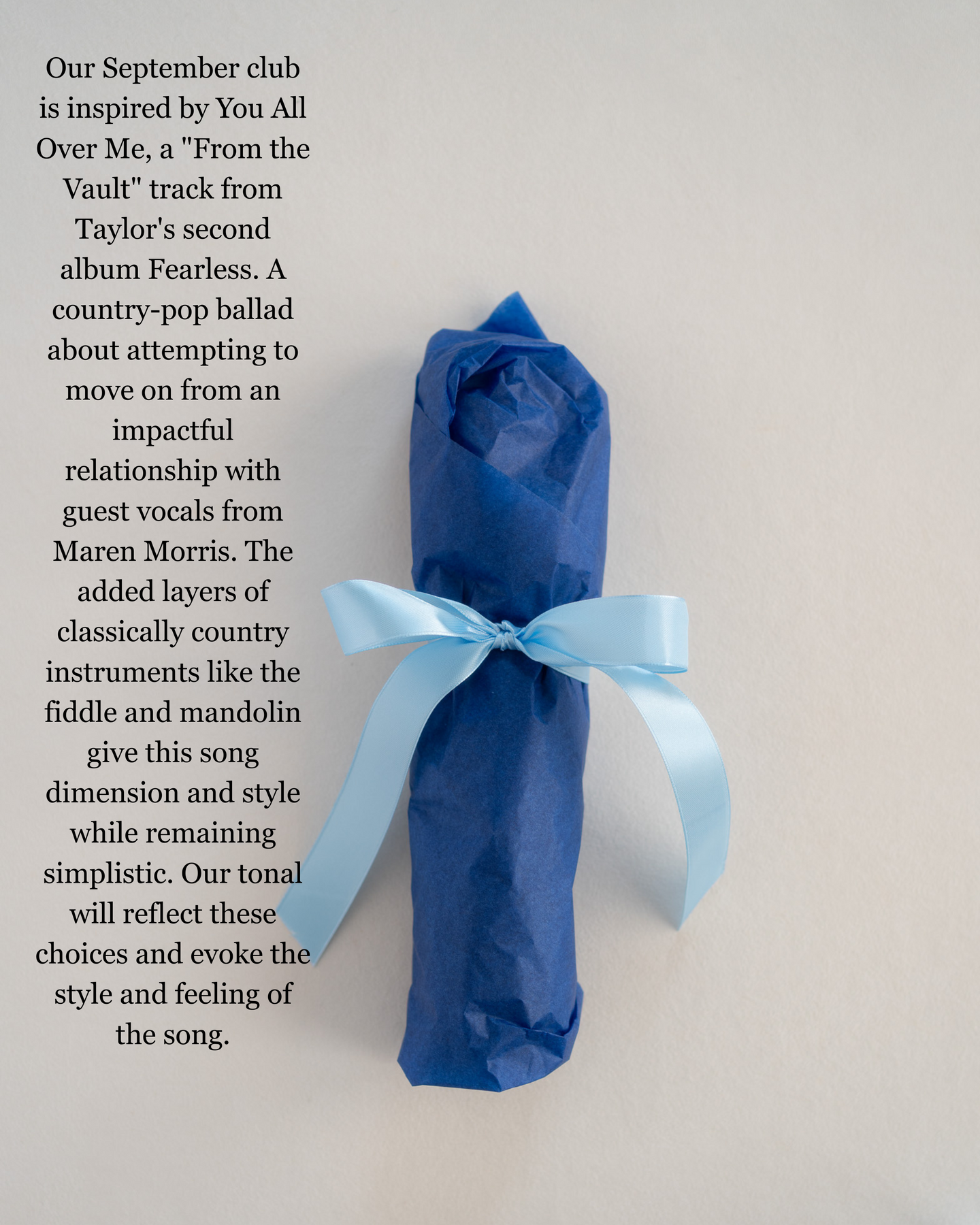 Our September club is inspired by You All Over Me, a "From the Vault" track from Taylor's second album Fearless. A country-pop ballad about attempting to move on from an impactful relationship with guest vocals from Maren Morris. The added layers of classically country instruments like the fiddle and mandolin give this song dimension and style while remaining simplistic. Our tonal will reflect these choices and evoke the style and feeling of the song.