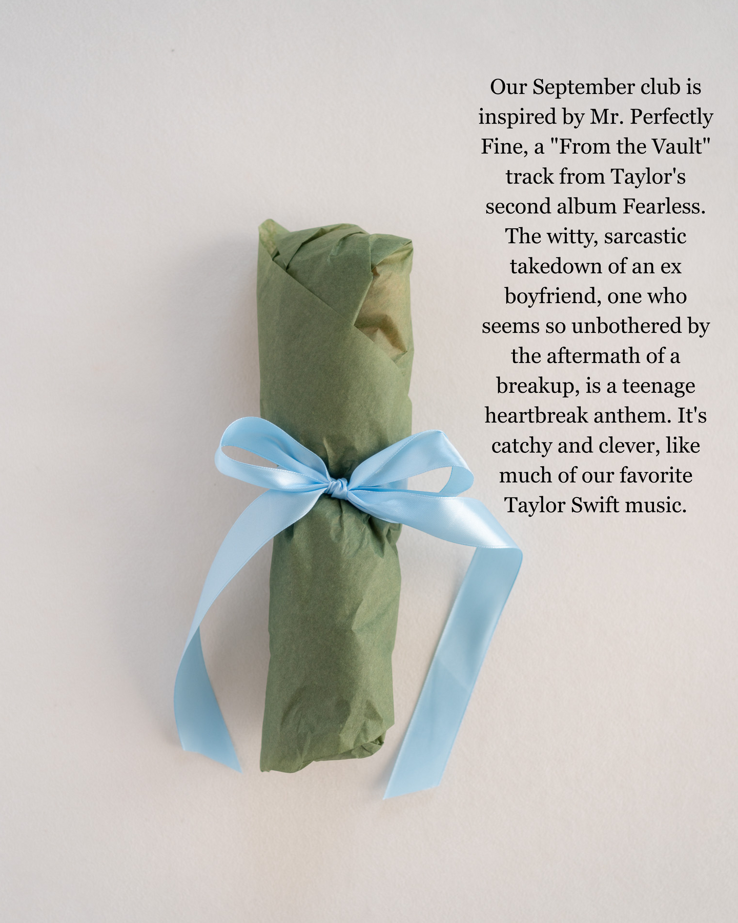 Our September club is inspired by Mr. Perfectly Fine, a "From the Vault" track from Taylor's second album Fearless. The witty, sarcastic takedown of an ex boyfriend, one who seems so unbothered by the aftermath of a breakup, is a teenage heartbreak anthem. It's catchy and clever, like much of our favorite Taylor Swift music.