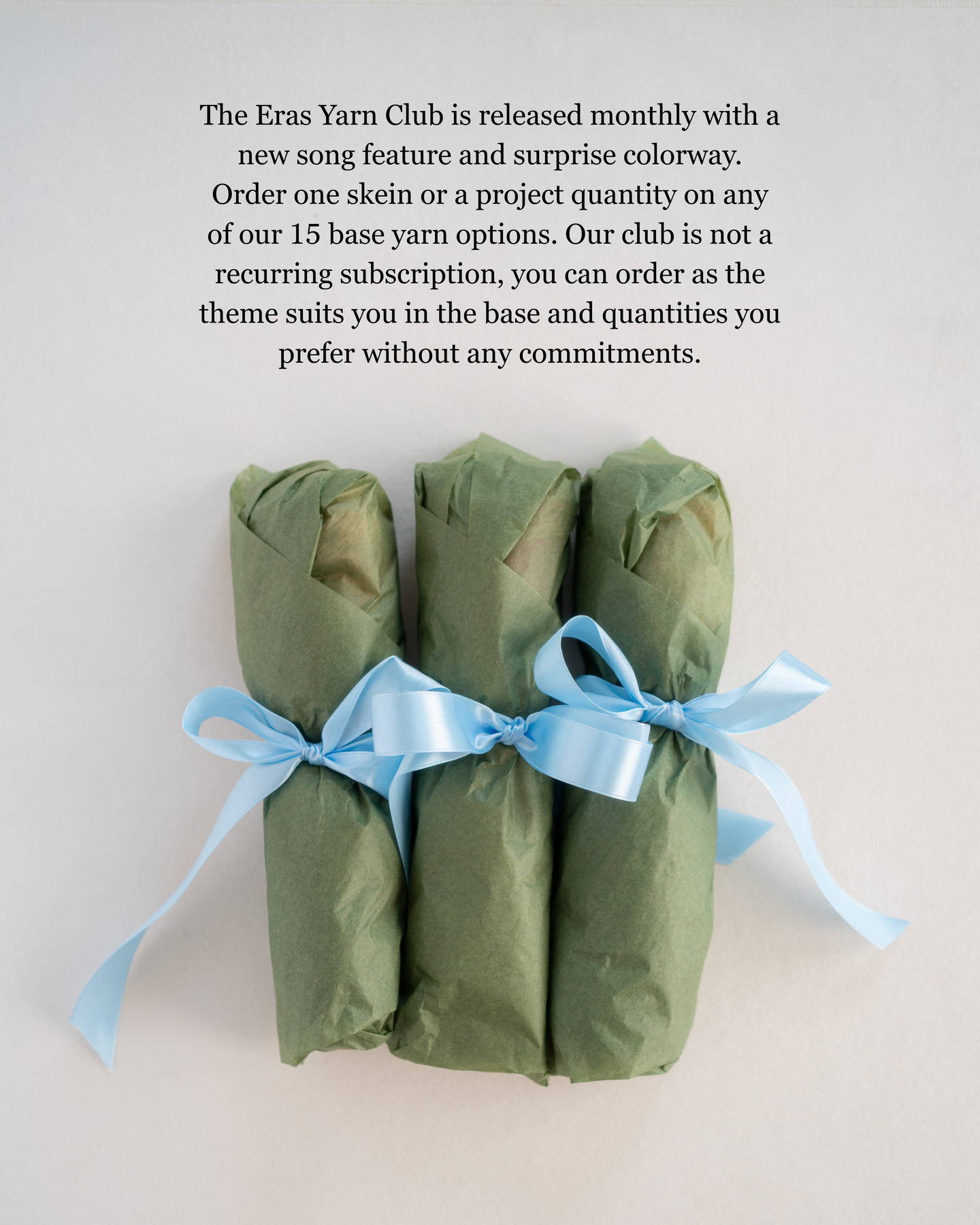 The Eras Yarn Club is released monthly with a new song feature and surprise colorway. Order one skein or a project quantity on any of our 15 base yarn options. Our club is not a recurring subscription, you can order as the theme suits you in the base and quantities you prefer without any commitments.