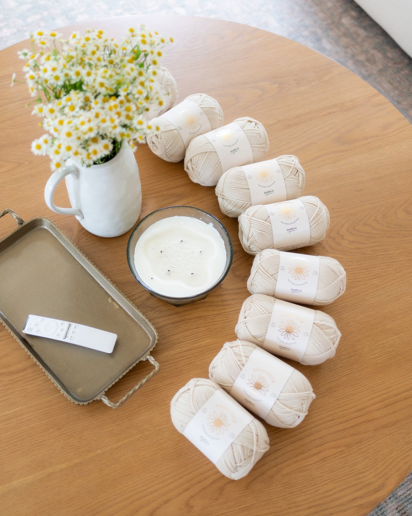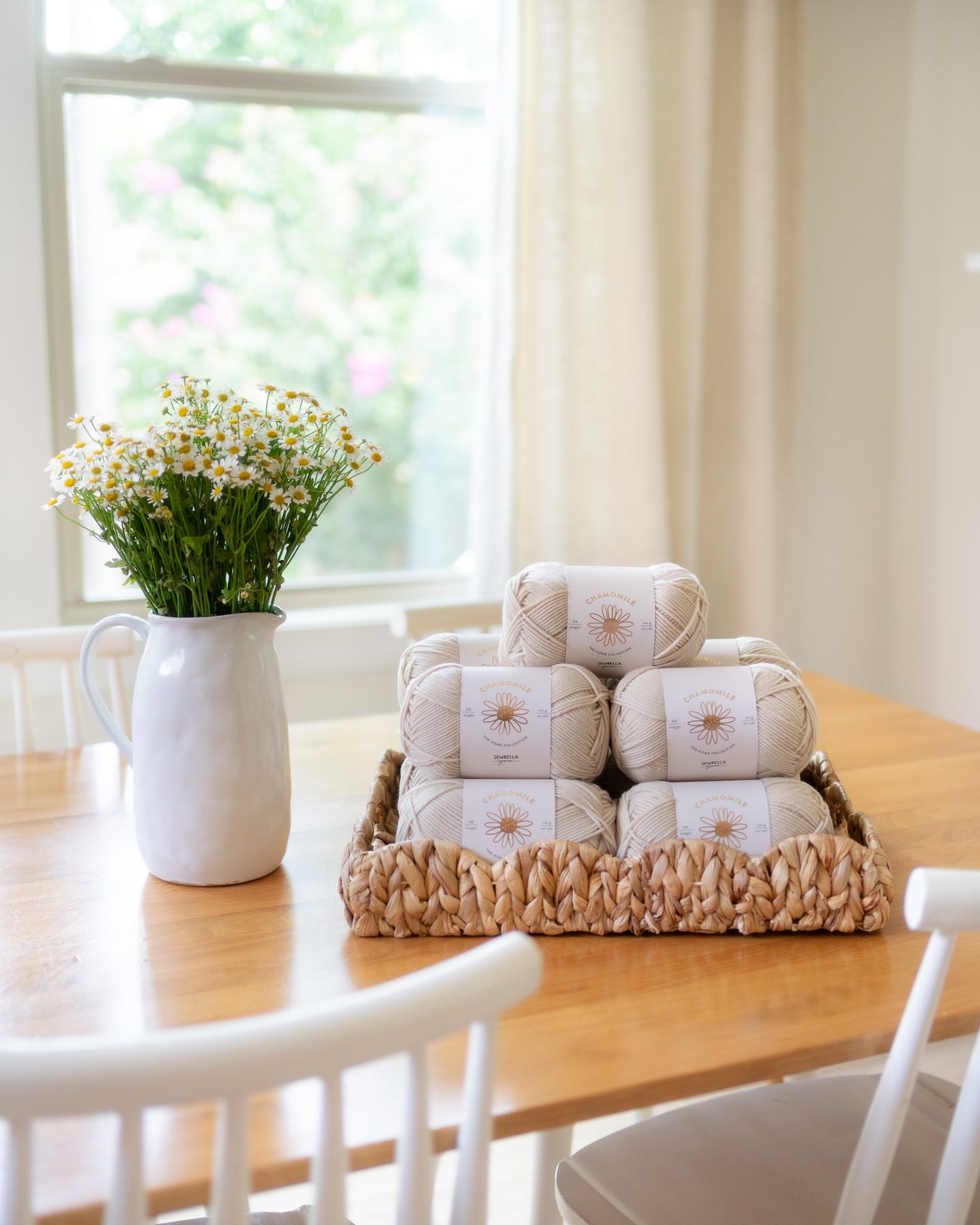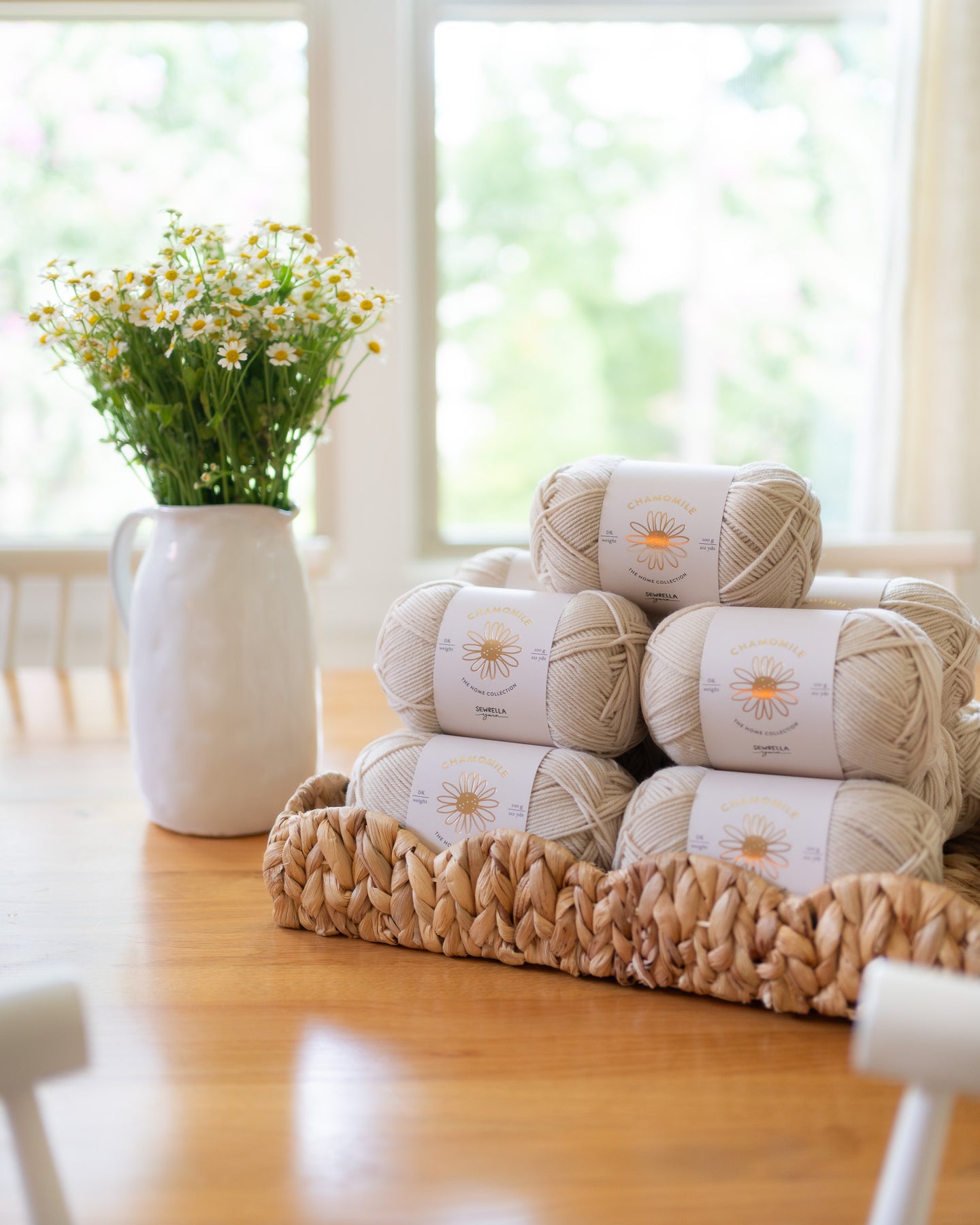 Chamomile is a beautiful little daisy like flower with a large fluffy yellow center and delicate white petals. When harvested and dried for tea, the colors dull and soften. You've probably heard that chamomile tea is great for calming before sleep, easing the symptoms of a cold, reducing inflammation and more. I've always got some in my pantry to brew when I need some comfort - I hope this yarn gives you that same feeling, something to keep around the house when you need a little comfort 💗