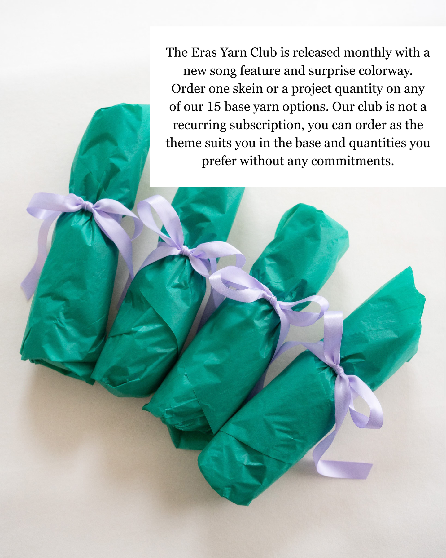 The Eras Yarn Club is released monthly with a new song feature and surprise colorway. Order one skein or a project quantity on any of our 15 base yarn options. Our club is not a recurring subscription, you can order as the theme suits you in the base and quantities you prefer without any commitments.
